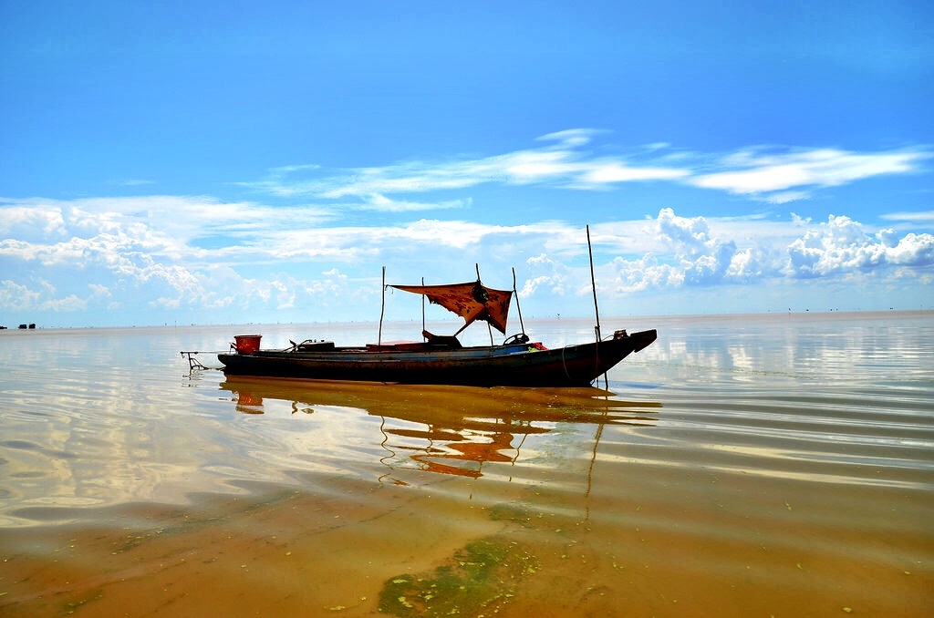 Fishing and rice are the industries of importance to the Tonlé Sap villagers, taking advantage of the change in seasons and the effect water has upon their lives. The small collections of huts on stilts were basic, just four walls and some furnishings, at least that’s all I could see. Boats lay about in the grass, just waiting for the waters to rise and make them useful again and kids jumped into the dank water, trying to stay cool on an oppressively hot day. As the water flow changes, many villagers move their entire homes, turning them into houseboats and floating to the next spot for the best fishing. After an hour (and two breakdowns) of puttering along the murky, brown river we arrived in what is the current lake, a reflective masterpiece I never would have expected.